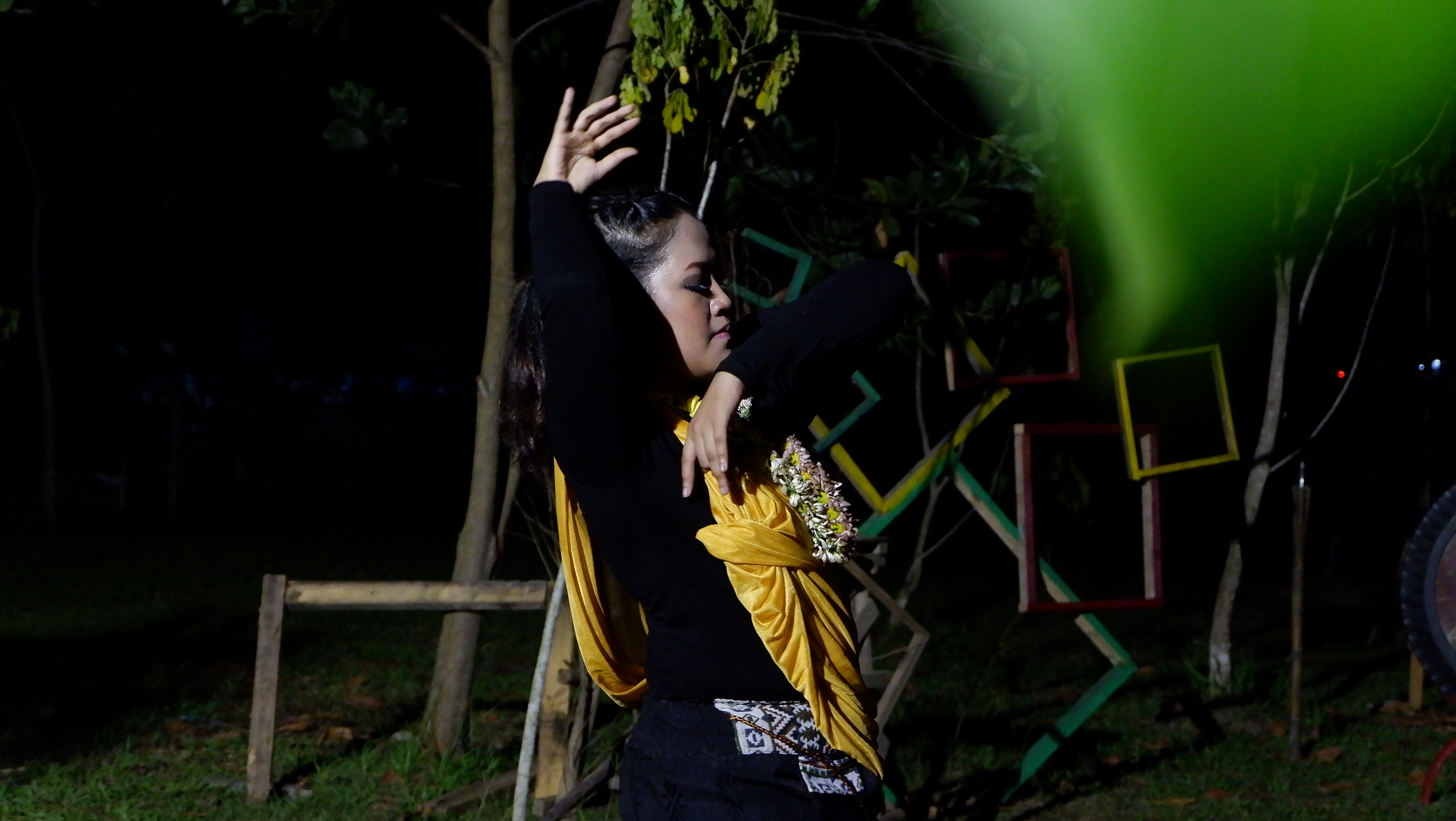 Terhitung dari jam empat sore hingga jam sepuluh malam, Dwitiya menggerakan tubuhnya sembari menyatu dengan penonton dan penari lainnya.