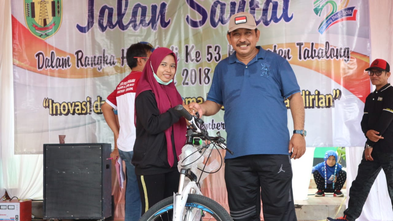 Jalan santai ini menyedaikan berbagai hadiah menarik, seperti barang elektronik dan sepeda. Kepala Dinas Pemuda, Olahraga dan Pariwisata Kabupaten Tabalong, Zain Ramali yang bertindak selaku ketua pelaksana mebenarkan hal tersebut. “Hari ini kami menyediakan 4 buah sepeda dan tv 32 dan banyak hadiah lainya.” Katanya saat diwawancarai disela acara pembagian hadiah.