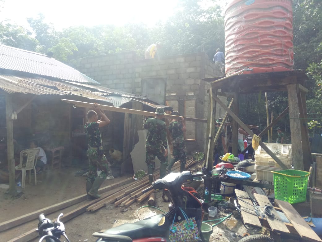 Di tengah-tengah kesibukan mengerjakan pekerjaan fisik TMMD, beberapa orang anggota Satgas masih menyempatkan diri untuk membantu warga yang sedang membangun rumah, semua ini dilakukan demi kemanunggalan antara TNI dengan rakyat benar-benar nyata.