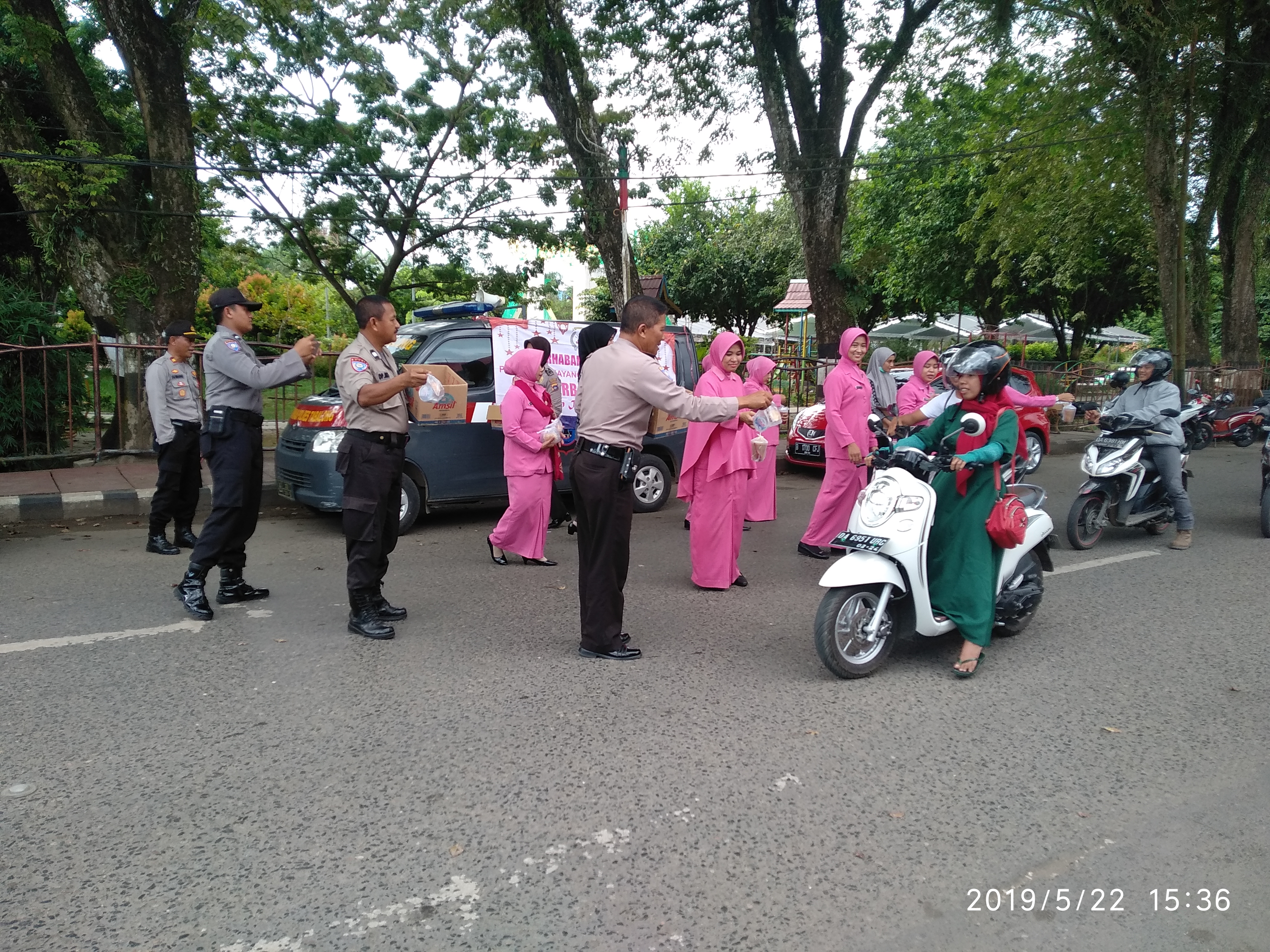 Dalam rangka menyemarakkan bulan suci ramadhan, menjelang waktu berbuka puasa sejumlah personel Polres Tabalong bersama dengan Bhayangkari menggelar acara bagi bagi takjil buka puasa di depan kantor Bank Kalsel Tanjung, Rabu 22 Mei 2019.