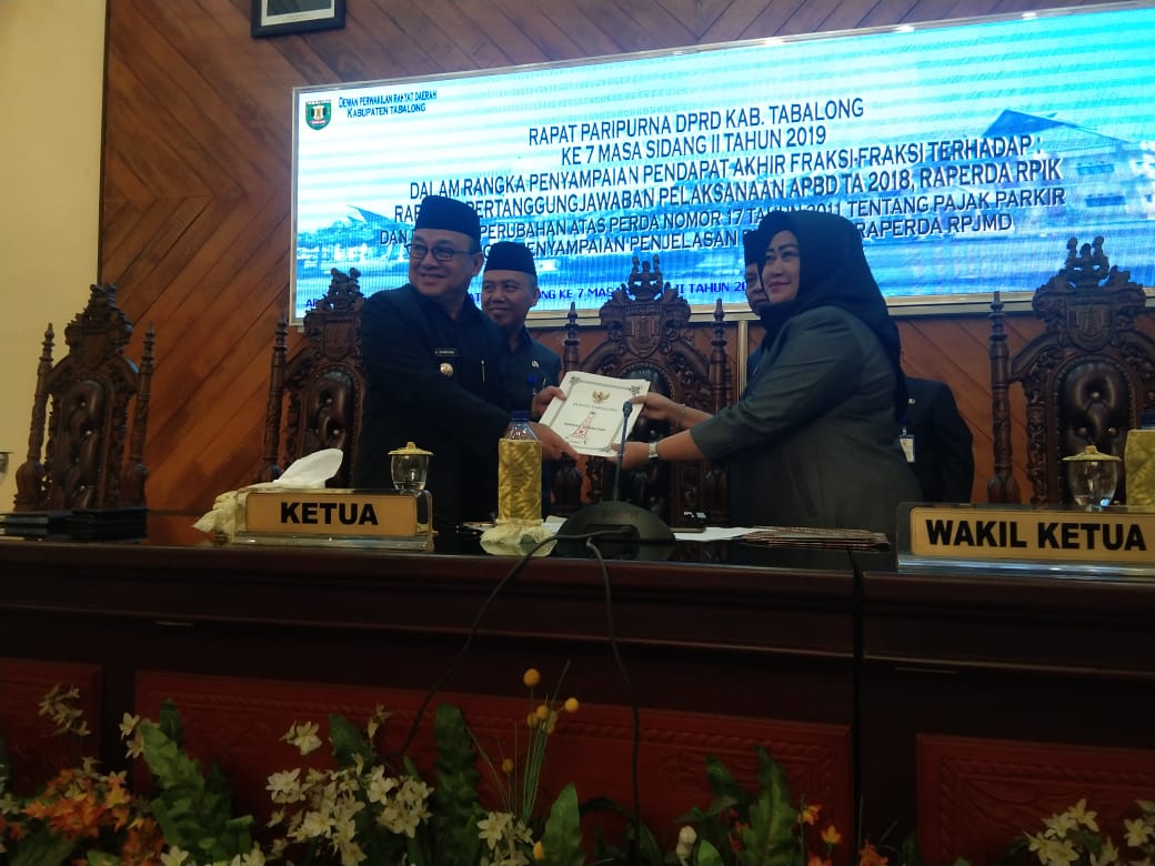 Tujuh fraksi yakni, Fraksi Golkar, Fraksi Demokrat, Fraksi PAN, Fraksi Hanura, Fraksi Gerindra dan dua fraksi gabungan menyatakan setuju terhadap Raperda Pertanggungjawaban Pelaksanaan APBD tahun 2018, Raperda RPIK dan Reperda Perubahan Perda Nomor 17 Tahun 2011 Tentang Pajak Parkir Sekaligus Penyampaian Penjelasan Bupati Atas Raperda RJPMD.