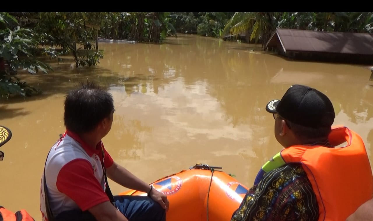 Menggunakan sepatu boot, Bupati Tabalong berjalan menyusuri area yang terendam banjir, yang didampingi Tim dari BPBD dan Dinas Sosial Tabalong.