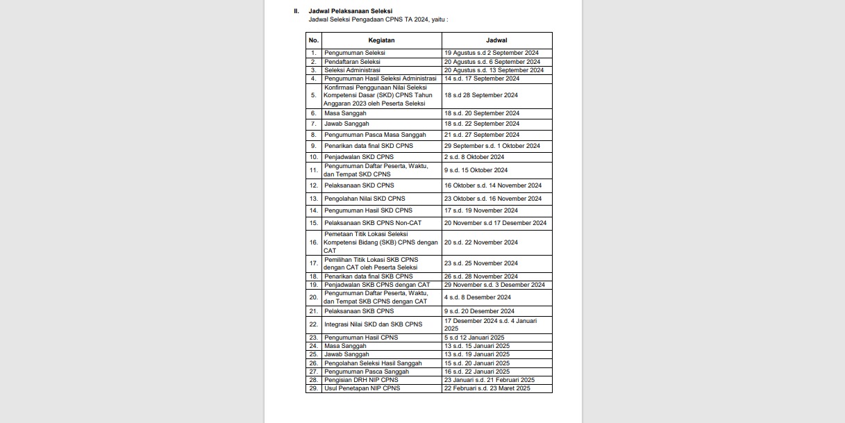 Jadwal seleksi pengadaan CPNS tahun 2024 termuat dalam surat Badan Kepegawaian Negara (BKN) nomor 5419/B-KS.04.01/SD/K/2024.