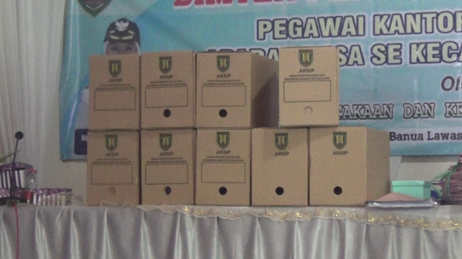 Untuk menunjang pengelolaan arsip yang tertata dengan baik, dalam kesempatan ini pihak Dispersip Tabalong juga menyerahkan bantuan kepada pihak Kecamatan Banua Lawas, yakni berupa boks arsip, kertas casing, map gantung, lembar deskripsi, serta tali rami.