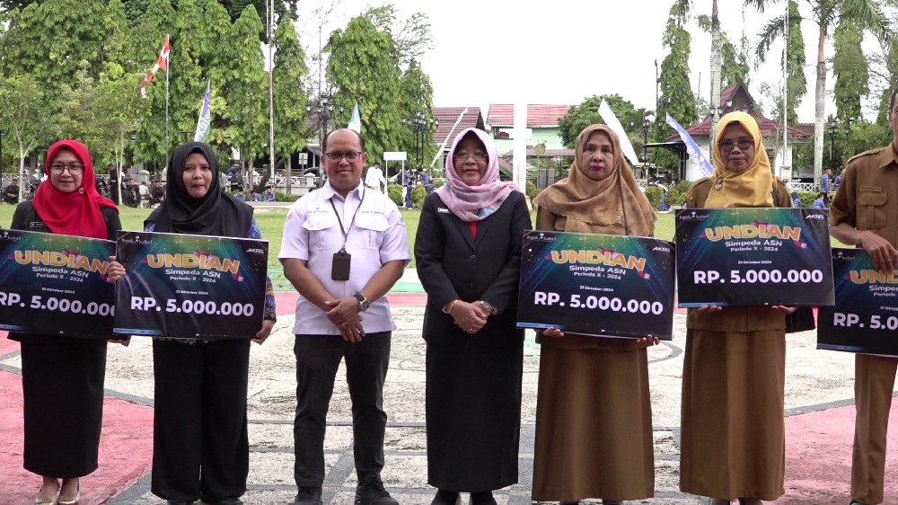 Hadiah undian Simpeda ASN periode 10 tahun 2024 Bank Kalsel diserahkan secara simbolis oleh Penjabat Bupati Tabalong, Hamida Munawarah, didampingi Kepala Bank Kalsel Cabang Tanjung, Mauludi.