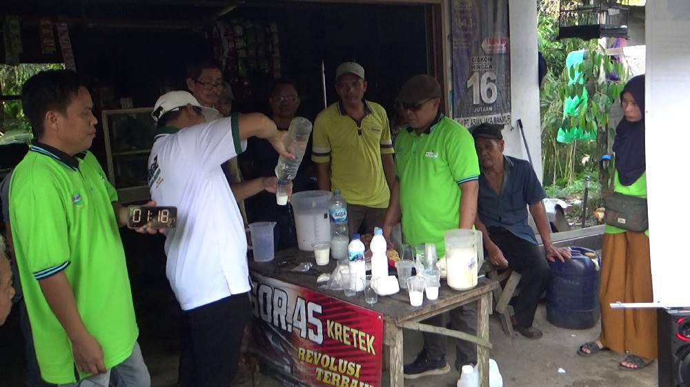 Tim pemasaran Usaha Dagang Berkah Rukun Makmur mengenalkan inovasi pengental karet Karaz kepada sejumlah masyarakat, khususnya petani karet di Desa Juai, Kecamatan Tanjung.