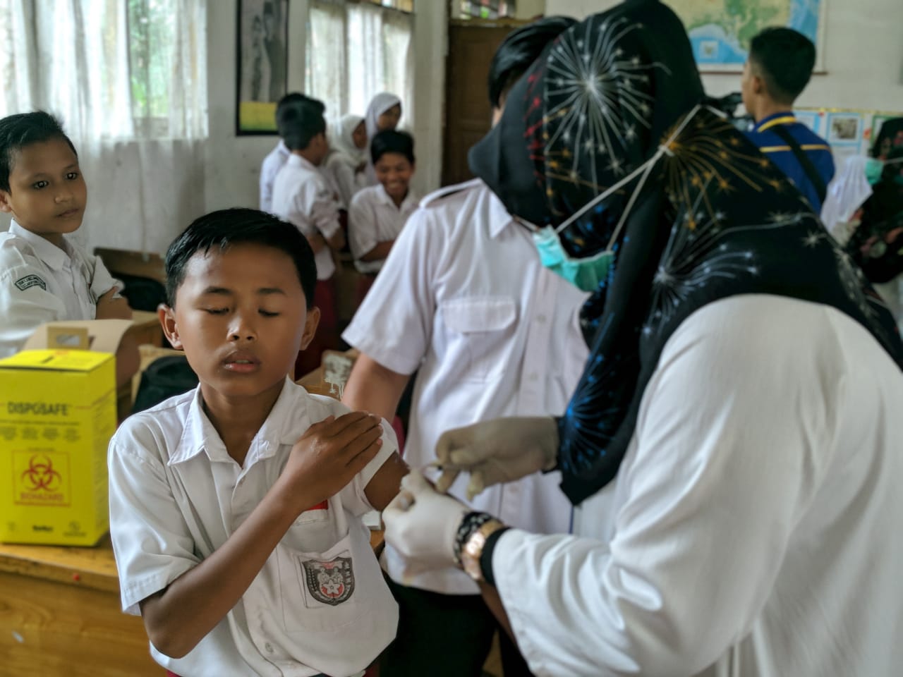 “Jadi kalau sudah ada persetujuan dari orang tua murid , formulir tersebut di isi dan di data terus diserahkan kepada petugas kesehatan yang menyatakan bahwa anak tersebut siap diberikan imunisasi.”jelasnya.