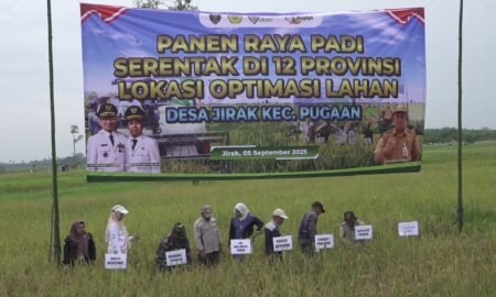 Panen raya padi serentak digelar di 12 provinsi seluruh Indonesia, termasuk di Kabupaten Tabalong, Kalimantan Selatan, pada 5 September 2025. Di...