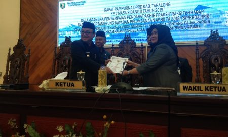 Tujuh fraksi yakni, Fraksi Golkar, Fraksi Demokrat, Fraksi PAN, Fraksi Hanura, Fraksi Gerindra dan dua fraksi gabungan menyatakan setuju terhadap Raperda Pertanggungjawaban...