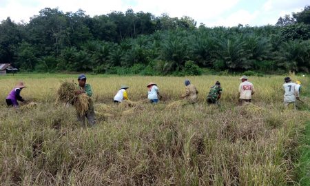 Anggota Satgas TMMD ke-104 Kodim 1008/Tanjung membantu petani panen padi di Desa Hayup Kec. Haruai, Jum’at (22/3/19) Tampak terlihat semangat gotong royong...