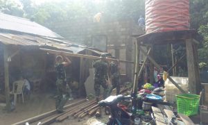 Di tengah-tengah kesibukan mengerjakan pekerjaan fisik TMMD, beberapa orang anggota Satgas masih menyempatkan diri untuk membantu warga yang sedang membangun rumah, semua...